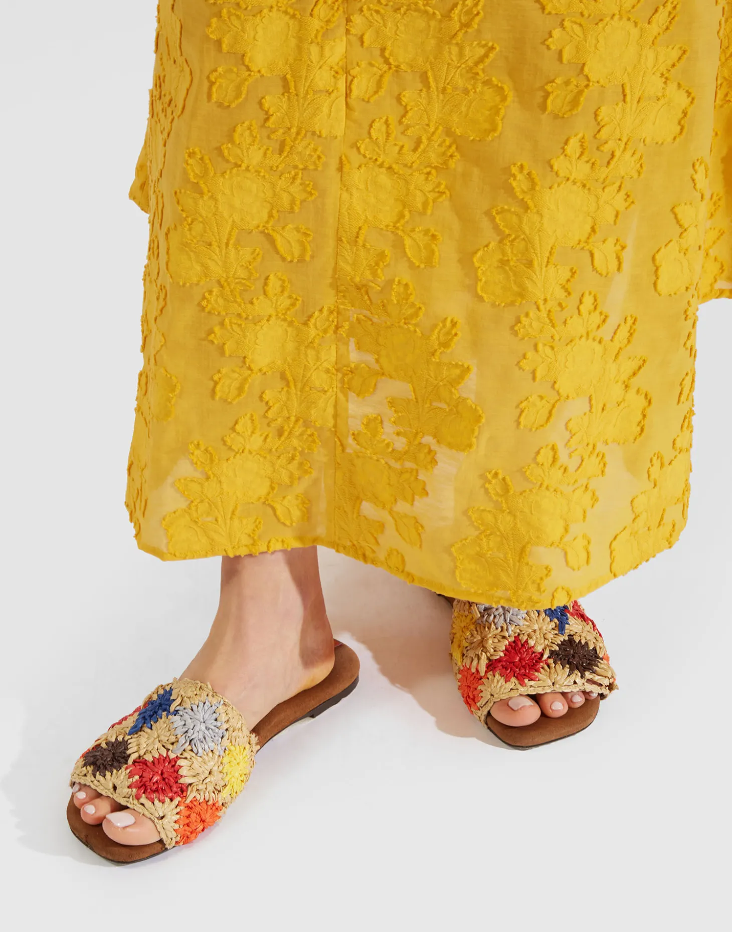 Handicraft goes haute in our crochet sandals that are 100% made in Italy and bring sunshine energy to the max. Done in knitted raffia in this multicolor motif, they are crafted by Italian heritage shoemakers Roveda and are comfy enough for all your summer sojourns, from Fiorentina pasticceria-hopping to Portofino beachclub cruising. Slip on and style with anything.