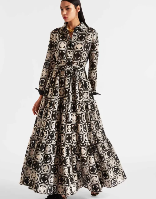 Bring back boho! Our whimsical Bellini Dress returns for another season crafted in this intricate macrame knit to bring a sultry vacation mood wherever you wear it. Its tactile fabrication is beautifully offset by its snappy collar and flowing three-tier skirt, and it comes with a removable belt which you can cinch for more waist. Romantic and really ravishing, wear it for cocktails with heaps of gold jewelry and a vacation glow.