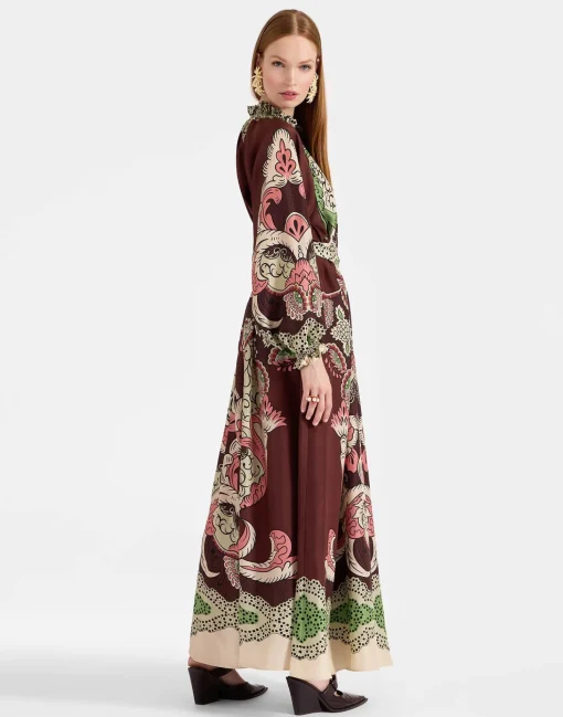 Named after the goddess of abundance, the gorgeous Cerere Dress brims with color and romance. Crafted from ultra lightweight silk voile that drapes like a dream, this floor-sweeping bella has an airy silhouette that can be cinched at the waist with removable sash if more shape is your thing. We love the romance in the little details – buttons at the neck, ruffle collar, puff sleeves – plus this gorgeous Renaissance-inspired print hand-placed by our Italian craftspeople.