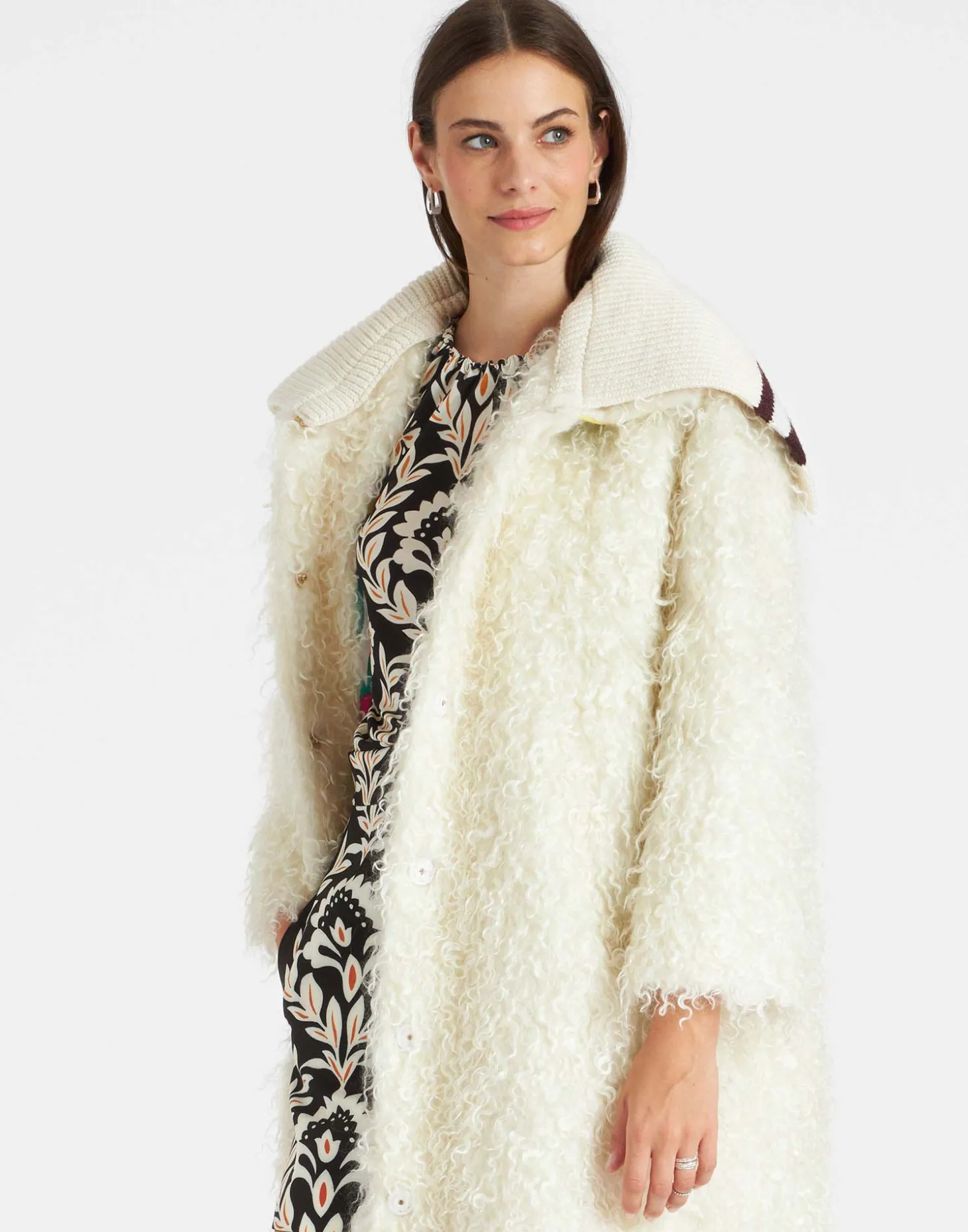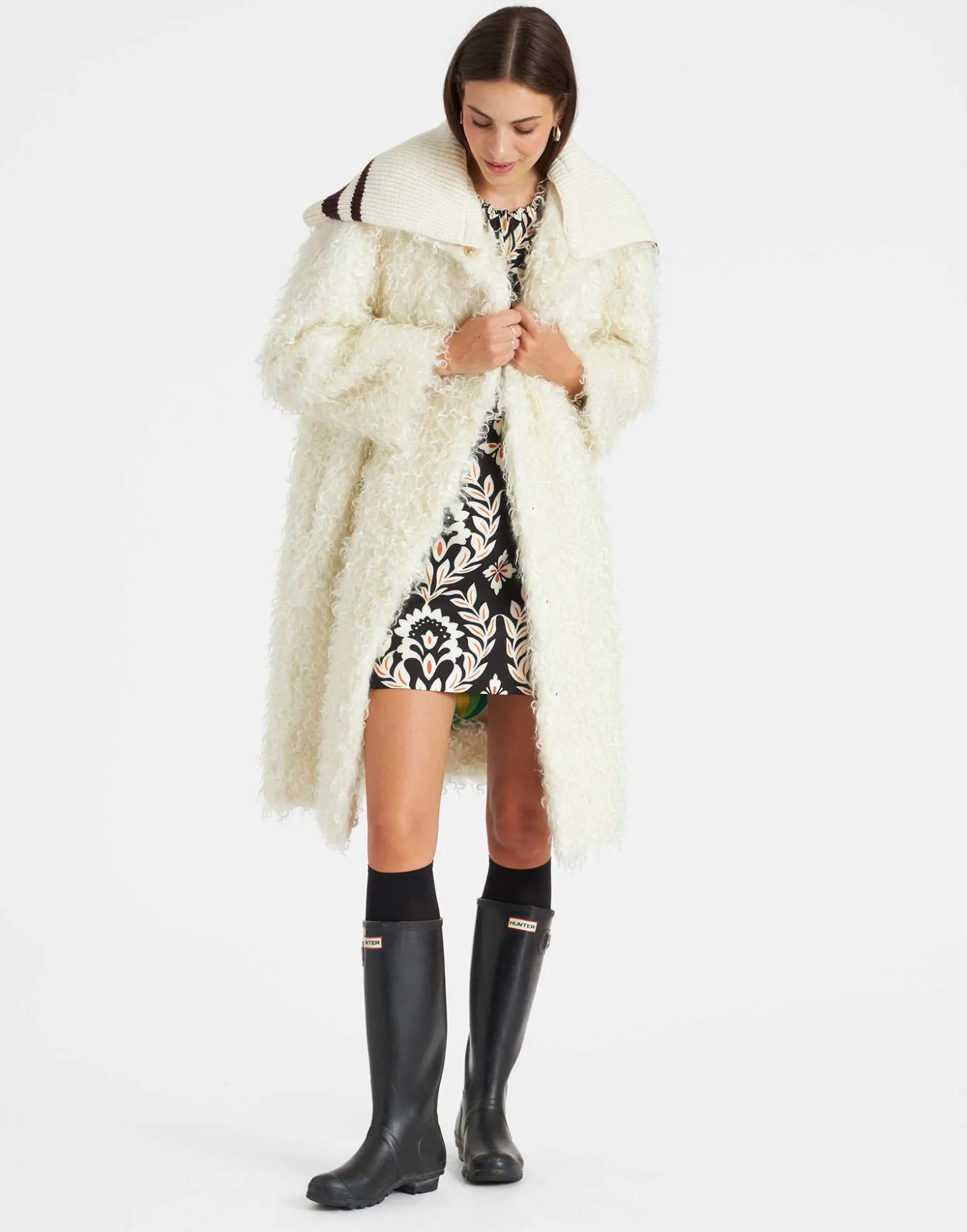 Named after the matriarch of maximalist flair, Iris Apfel, this ultra-luxe coat doesn’t disappoint when it comes to bracing cold weather with statement-making style. Fluffy and oversized, belissima and bold, it arrives in faux fur mohair wool (for extra warmth) with a removable knitted collar (for extra chic) and is so strokably delightful it really won’t matter what you put on underneath. In case you’re interested, we’ll be rocking it Apfel-style with sunglasses and printed jeans.