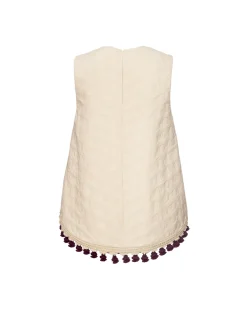 As far as interesting silhouettes go; this top may win the gold star. The asymmetrical hem, trapeze silhouette and contrast macrame tassels creates an alluring form. In sumptuous creamy jacquard which has a textured surface feel, it’s undoubtedly upscale but looks equally as great with some jeans and flats.