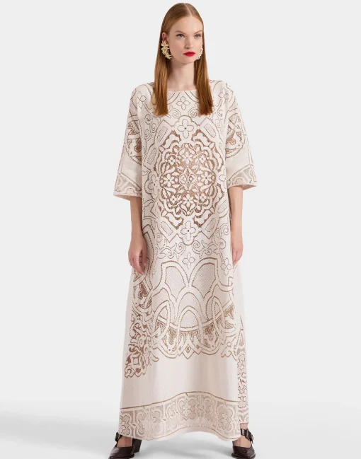 Make way for dreamtime dressing with this ethereal take on our MuuMuu Kaftan, ridiculously romantic and exquisitely embroidered in our light white cotton lace. Unlined to highlight all those gorgeous details, this big volume bella begs for a black tie entrance, with an ultra-generous silhouette that will flow behind you as you float around the room. Every bit as heavenly thrown over your swimming costume for the most divine poolside look the Mediterranean has ever seen.