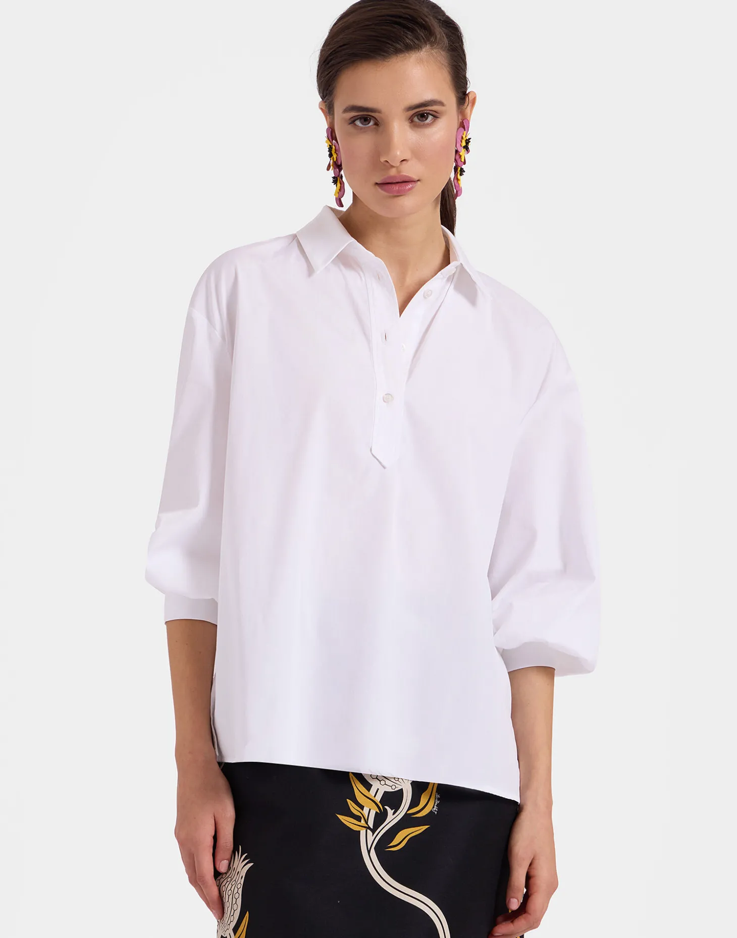 Not all shirts are created equal, friend. Enter the Poet Shirt, with its voluminous sleeves, pleats in the back and romantic cut, it’s a bonafide where-did-you-get-that number. A tent shape that looks great on all shapes and sizes, this version arrives in our tailored cotton poplin for throwing over a swimsuit while you yacht around Capri. Eye-catching left loose but beautiful tucked into pants, too.