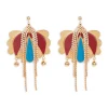 The eye-catching floral motif of these Tulip Earrings is inspired by J.J.’ s research into Transylvanian patterns in the gallerist and collector Miki Von Bartha’s archives. Traditionally found painted in homes and on furniture, these tulips have been given the maximalist treatment with strings of diamond-like glass crystals, little baubles, and have been painted in glossy blue and red enamel. Especially for you magpies, the gold-tinted brass is polished to a mirror shine.