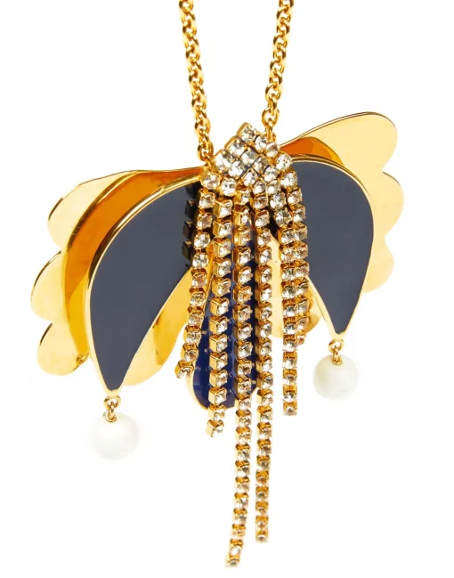 The eye-catching floral motif of this Tulip Necklace is inspired by J.J.’ s research into Transylvanian patterns in the gallerist and collector Miki Von Bartha’s archives. Traditionally found painted in homes and on furniture, this tulip has been given the La DoubleJ treatment with strings of diamond-like glass crystals, little baubles and has been painted with two shades of glossy blue enamel. Especially for you magpies, the gold-tinted brass is polished to a mirror shine.